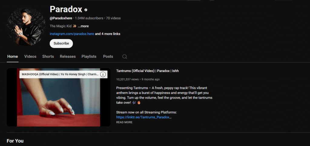 2020 में उन्होंने अपना यूट्यूब चैनल “Paradox” शुरू किया। आज उनके चैनल पर 5,80,000 से ज्यादा सब्सक्राइबर्स हैं। उनके मुख्य गानों में हैं: