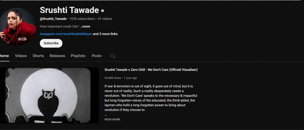 आज Shrushti Tawde Spotify पर 96,392 मासिक श्रोताओं के साथ एक प्रसिद्ध कलाकार हैं। उनके गानों को करोड़ों व्यूज मिल चुके हैं और वह भारतीय Hip-Hop की नई पीढ़ी का चेहरा हैं। Warner Music India के साथ उनका करार उनकी बढ़ती लोकप्रियता का सबूत है।